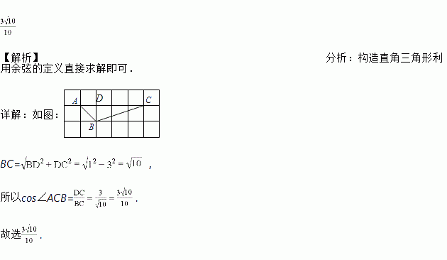如图,方格纸中的每个小方格都是边长为1的正方形,△ABC的顶点都在格点上,则cos∠ACB的值为_________