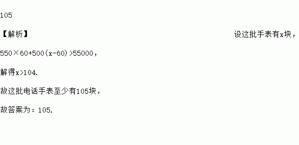 某经销商销售一批电话手表,第一个月以550元/块的价格售出60块,第二个月起降价,以500元/块的价格将这批电话手表全部售出,销售总额超过了5.5万元,这批电话手表至少有_____块.