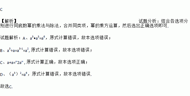 A. a3•a3=2a3 B. a3÷a=a3 C. a+a=2a D. (a3)2=a5