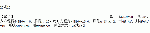 25或16 【解析】【解析】 当AB=BC=8,把x=8代入方程得64﹣80+m=0,解得m=16,此时方程为x2﹣10x+16=0,解得x1=8,x2=2;当AB=AC,则AB+AC=10,所以AB=AC=5,则m=5×5=25.故答案为:25或16.