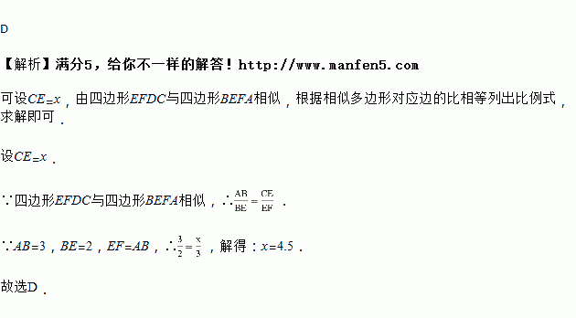 如图,已知矩形ABCD中,AB=3,BE=2,EF⊥BC.若四边形EFDC与四边形BEFA相似而不全等,则CE=( )