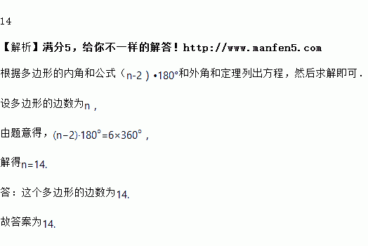 若一个多边形的内角和为其外角和的6倍,则这个多边形的边数为______.