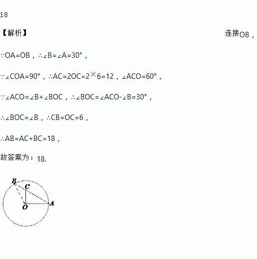 如图,AB是⊙O的弦,∠OAB=30°.OC⊥OA,交AB于点C,若OC=6,则AB的长等于_________.