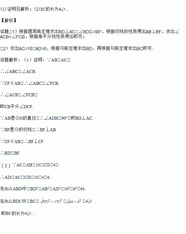 (2)若AB=10,CD=4,求BC的长.