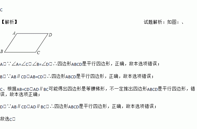 C 【解析】试题解析:如图:、 A、∵∠A=∠C,∠B=∠D,∴四边形ABCD是平行四边形,正确,故本选项错误; B、∵AB∥CD,AB=CD,∴四边形ABCD是平行四边形,正确,故本选项错误; C、根据AB=CD,AD∥BC可能得出四边形是等腰梯形,不一定推出四边形ABCD是平行四边形,错误,故本选项正确; D、∵AB∥CD,AD∥BC,∴四边形ABCD是平行四边形...