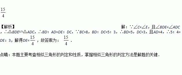 如图,△ABC中,AE交BC于点D,∠C=∠E,AD=4,BC=8,BD:DC=5:3,