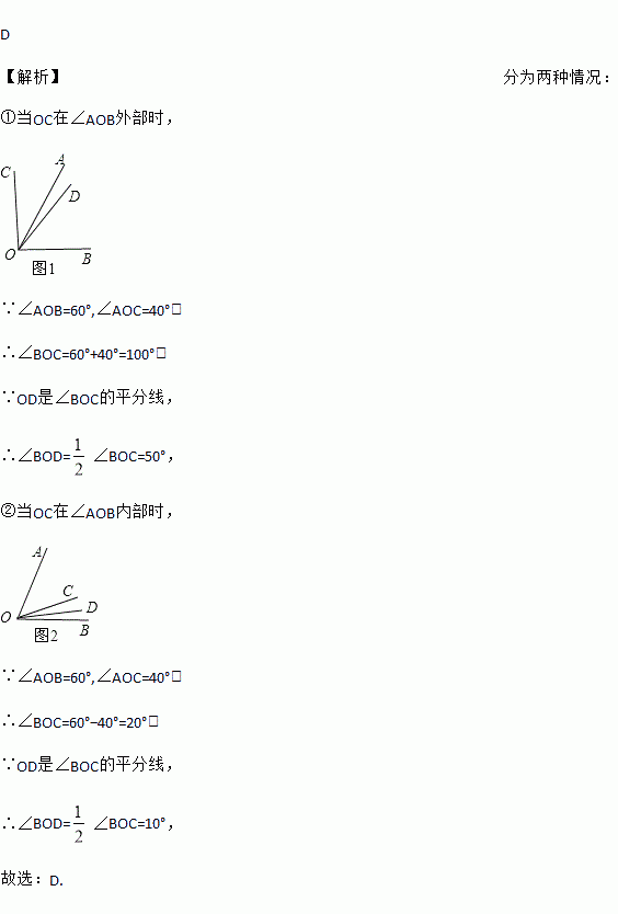 D 【解析】分为两种情况: ①当OC在∠AOB外部时, ∵∠AOB=60°,∠AOC=40°, ∴∠BOC=60°+40°=100°, ∵OD是∠BOC的平分线, ∴∠BOD=∠BOC=50°, ②当OC在∠AOB内部时, ∵∠AOB=60°,∠AOC=40°, ∴∠BOC=60°?40°=20°, ∵OD是∠BOC的平分线, ∴∠...