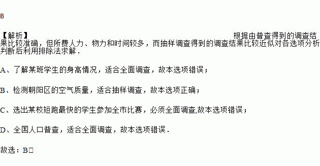 A. 了解某班学生的身高情况 B. 检测朝阳区的空气质量