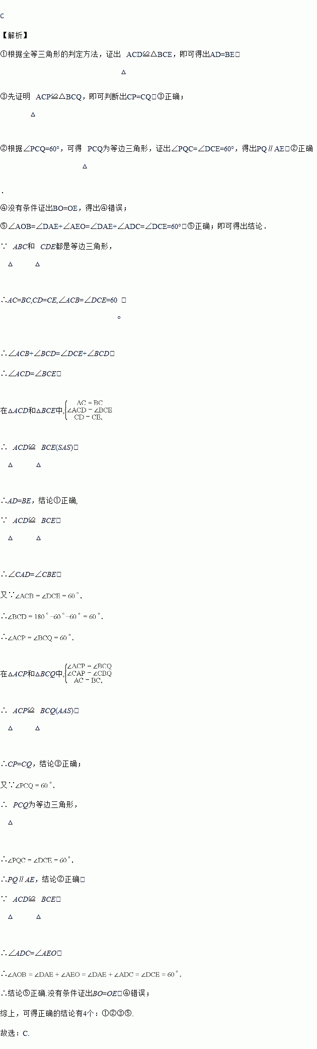 如图,C为线段AE上一动点(不与A、E重合),在AE同侧分别作等边△ABC和等边△CDE,AD与BE交于点O,AD与BC交于点P,BE与CD交于点Q,连接PQ,以下五个结论:①AD=BE;②PQ∥AE;③CP=CQ;④BO=OE;⑤∠AOB=60°,恒成立的结论有
