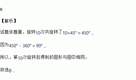 有两个完全重合的矩形,将其中一个始终保持不动,另一个矩形绕其对称中心O按逆时针方向进行旋转,每次均旋转45°,第1次旋转后得到图 ①,第2次旋转后得到图6②,…,则第10次旋转后得到的图形与图①~④中相同的是( )