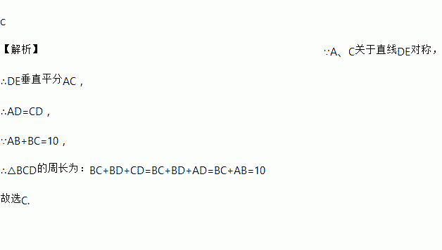 C 【解析】∵A、C关于直线DE对称, ∴DE垂直平分AC, ∴AD=CD, ∵AB+BC=10, ∴△BCD的周长为:BC+BD+CD=BC+BD+AD=BC+AB=10 故选C.