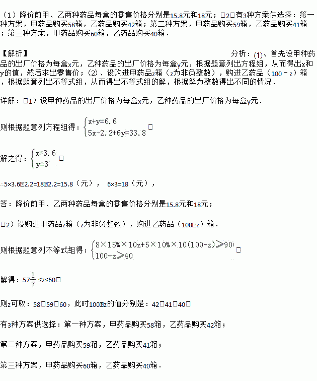 (1)降价前,甲乙两种药品每盒的出厂价格之和为6.6元.经过若干中间环节,甲种药品每盒的零售价格比出厂价格的5倍少2.2元,乙种药品每盒的零售价格是出厂价格的6倍,两种药品每盒的零售价格之和为33.8元.那么降价前甲、乙两种药品每盒的零售价格分别是多少元?
