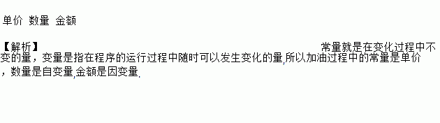 单价 数量 金额 【解析】常量就是在变化过程中不变的量,变量是指在程序的运行过程中随时可以发生变化的量,所以加油过程中的常量是单价,数量是自变量,金额是因变量.