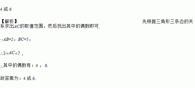 已知△ABC 中,AB=2,BC=5,且 AC 的长为偶数,则 AC 的长为_____.