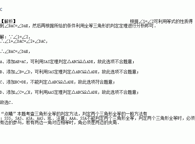 已知:如图,AB=AD,∠1=∠2,以下条件中,不能推出△ABC≌△ADE的是( )