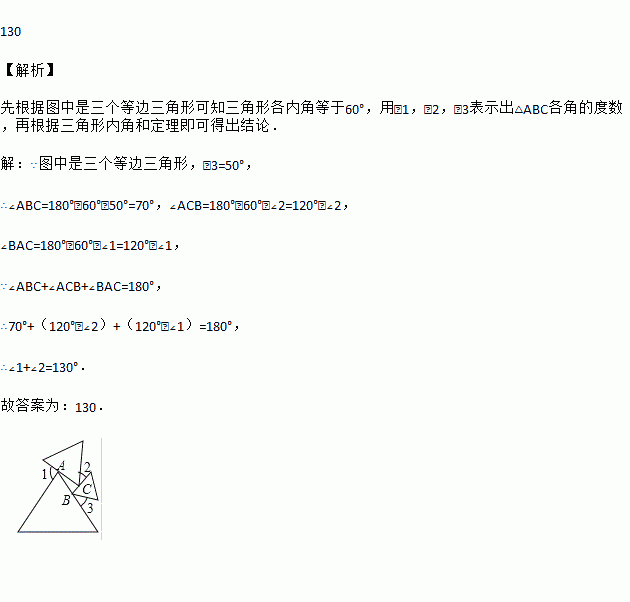 三个等边三角形的位置如图所示,若∠3=50°,则∠1+∠2= °.