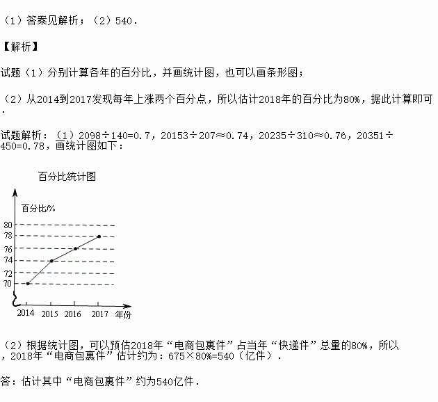 (2)若2018年“快递件”总量将达到675亿件,请估计其中“电商包裹件”约为多少亿件?