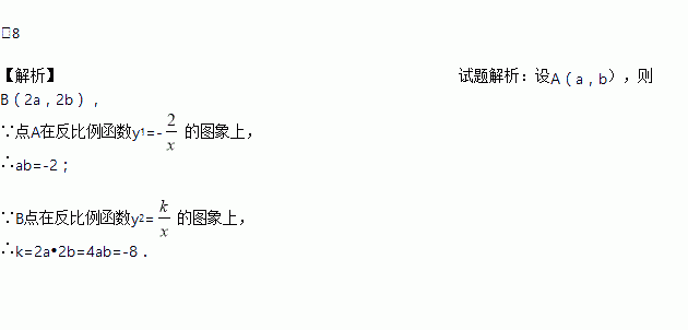 如图,已知点A,B分别在反比例函数y1=-和y2=的图象上,若点A是线段OB的中点,则k的值为________.