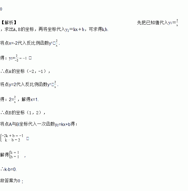 如图,反比例函数y1=与一次函数y2=kx+b的图象交于A、B两点,其中点A的横坐标为-2,B点的纵坐标为2,则k-b=______.