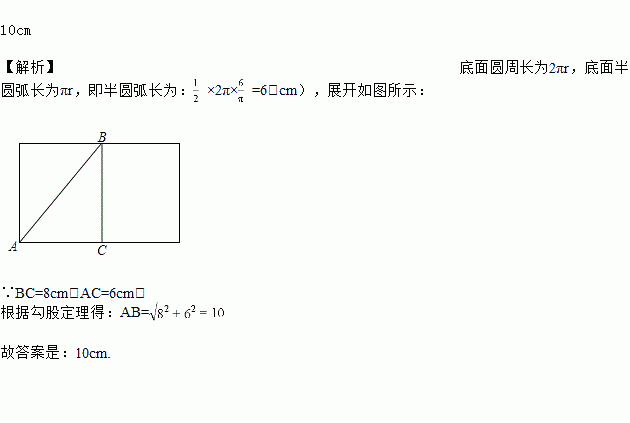 如图,一圆柱高8 cm,底面半径为 cm,一只蚂蚁从点爬到点处吃食,要爬行的最短路程是________.
