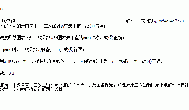 ②二次函数y1的图象关于直线x=﹣1对称