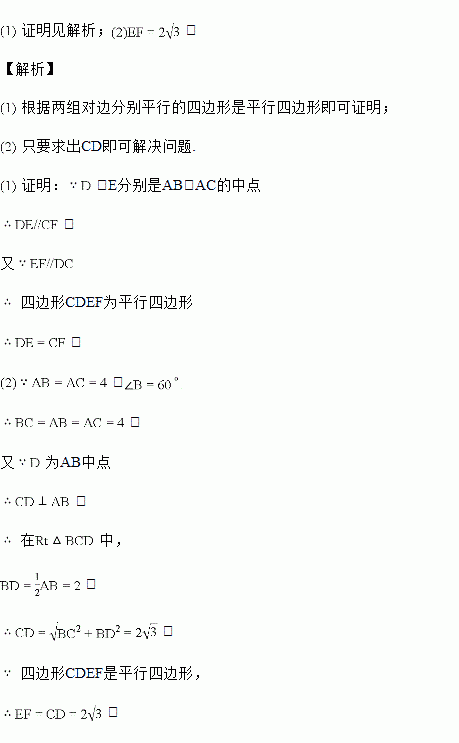 如图,△ABC中,AB=AC=4,D、E分别为AB、AC的中点,连接CD,过E作EF∥DC交BC的延长线于F;