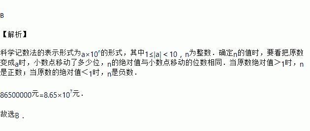 为创建国家文明城市,近两年全市投入“创文”的资金约为86500000元,这个数据用科学记数法表示为![]()