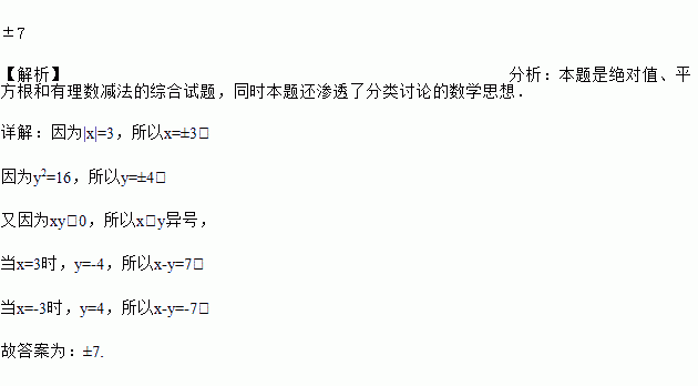 已知|x|=3,y2=16,xy<0,则x﹣y=_____.