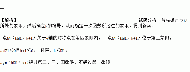若点M(k﹣1,k+1)关于y轴的对称点在第四象限内,则一次函数y=(k﹣1)x+k的图象不经过第 象限.