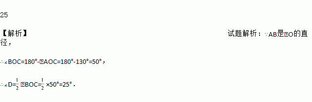 如图,AB是⊙O的直径,C、D为圆上两点,∠AOC =130°,则∠D等于_____度