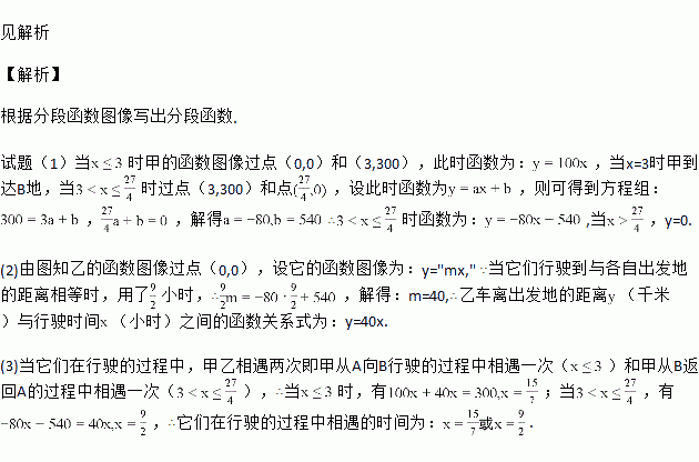已知:甲、乙两车分别从相距300千米的两地同时出发相向而行,其中甲到![]()