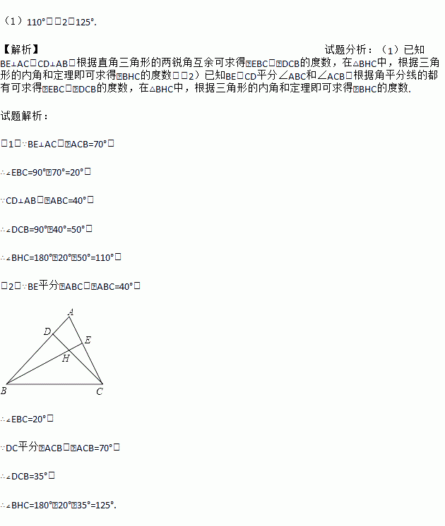 如图锐角△ABC,若∠ABC=40°,∠ACB=70°,点D、E在边AB、AC上,CD与BE交于点H.