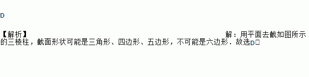 D 【解析】【解析】 用平面去截如图所示的三棱柱,截面形状可能是三角形、四边形、五边形,不可能是六边形.故选D.