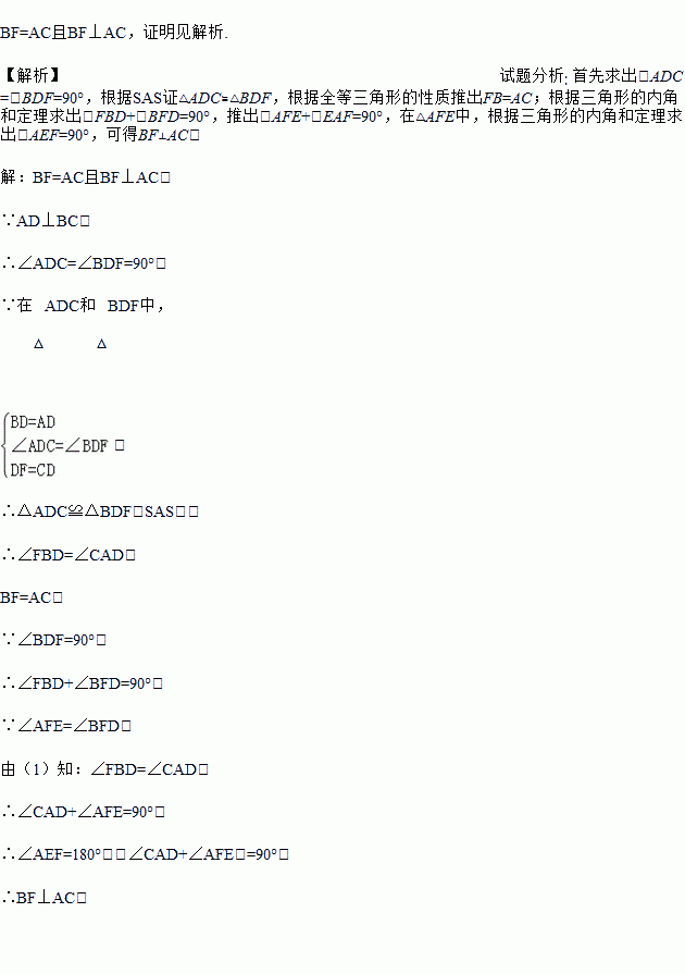 如图,△ABC中,AD⊥BC于D,若BD=AD,FD=CD.猜想:BF与AC的关系,并证明.