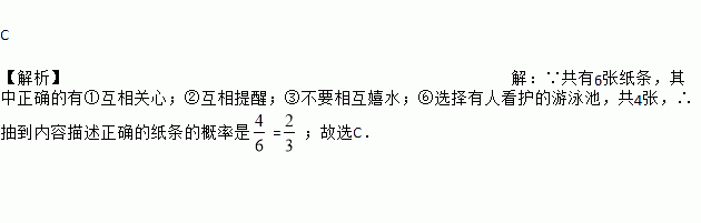 某学校在进行防溺水安全教育活动中,将以下几种在游泳时的注意事项写在纸条上并折好,内容分别是:①互相关心;②互相提醒;③不要相互嬉水;④相互比潜水深度;⑤选择水流湍急的水域;⑥选择有人看护的游泳池.小颖从这6张纸条中随机抽出一张,抽到内容描述正确的纸条的概率是( )