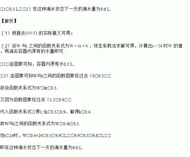 水龙头关闭不紧会造成滴水,小明用可以显示水量的容器做图①所示的试验,并根据试验数据绘制出图②所示的容器内盛水量W(L)与滴水时间t(h)的函数关系图象,请结合图象解答下列问题: