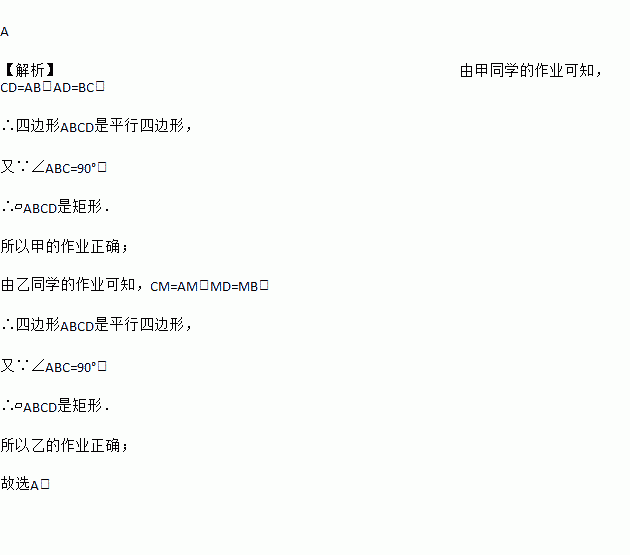 如已知:线段AB,BC,∠ABC = 90°. 求作:矩形ABCD. 以下是甲、乙两同学的作业: