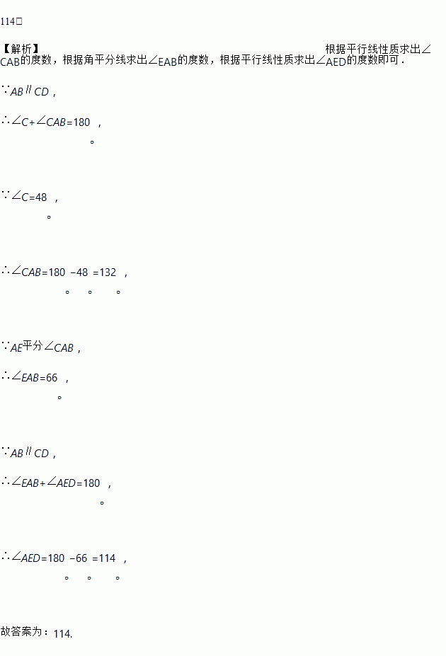如图,AB∥CD,AE平分∠CAB交CD于点E,若∠C=48°,则∠AED为 °.