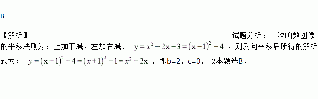 B 【解析】试题分析:二次函数图像的平移法则为:上加下减,左加右减. ,则反向平移后所得的解析式为: ,即b=2,c=0,故本题选B.
