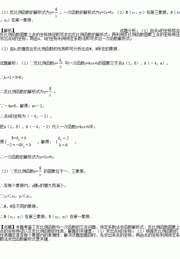 与一次函数y=k2x+b的图象交于点A(1,8)、B(﹣4,m).