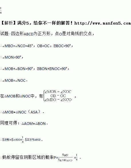 如图,一只蚂蚁在正方形ABCD区域内爬行,点O是对角线的交点,∠MON=90°,OM,ON分别交线段AB,BC于M,N两点,则蚂蚁停留在阴影区域的概率为_____.