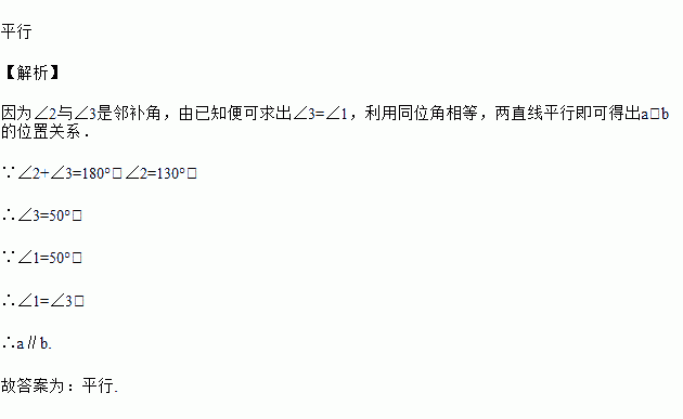 如图,两直线a.b被第三条直线c所截,若∠1=50°,∠2=130°,则直线a.b的位置关系是____________ .