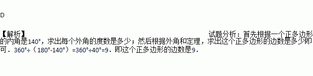 已知一个正多边形的一个内角是140°,则这个正多边形的边数是()