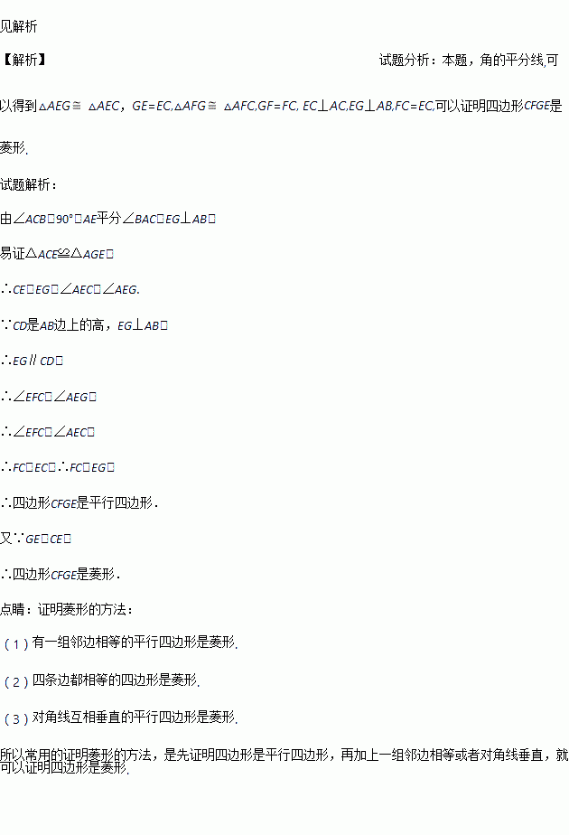 如图,在△ABC中,∠ACB=90°,CD是AB边上的高,∠BAC的平分线AE交CD于点F,交BC于点E,过点E作EG⊥AB于G,连结GF.求证:四边形CFGE是菱形.