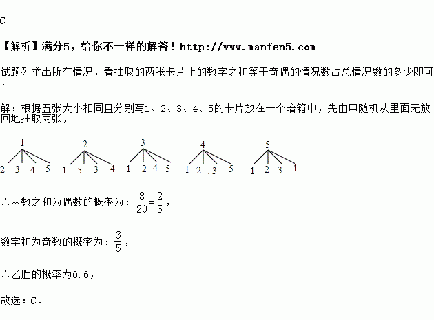 把五张大小相同且分别写1、2、3、4、5的卡片放在一个暗箱中,先由甲随机从里面无放回地抽取两张,并记下两个数字之和后把卡片再放入暗箱,再由乙从里面无放回地抽取两张,并记下两个数字之和,若数字和为偶数则甲胜,若数字和为奇数则乙胜,则有( )