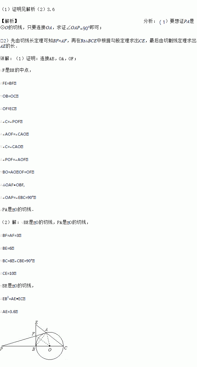 已知:A是以BC为直径的圆上的一点,BE是⊙O的切线,CA的延长线与BE交于E点,F是BE的中点,延长AF,CB交于点P.
