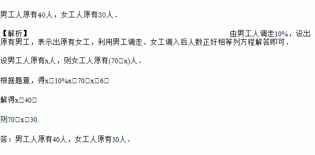 某工厂男、女工人共70人,男工人调走10%,女工人调入6人,这时,男、女工人数正好相等,则原来男、女工人各有多少人?