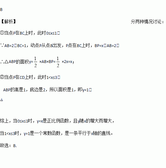 如图,在长方形ABCD中,AB=2,BC=1,运点P从点B出发,沿路线BCD作匀速运动,那么△ABP的面积与点P运动的路程之间的函数图象大致是( ).