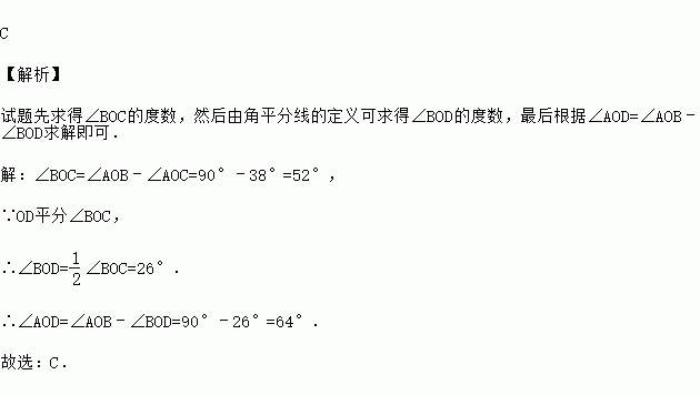 如图,∠AOB是直角,∠AOC=38°,OD平分∠BOC,则∠AOD的度数为( )