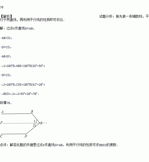 已知:如图,AB∥CD,若∠ABE=130°,∠CDE=152°,则∠BED=__度.